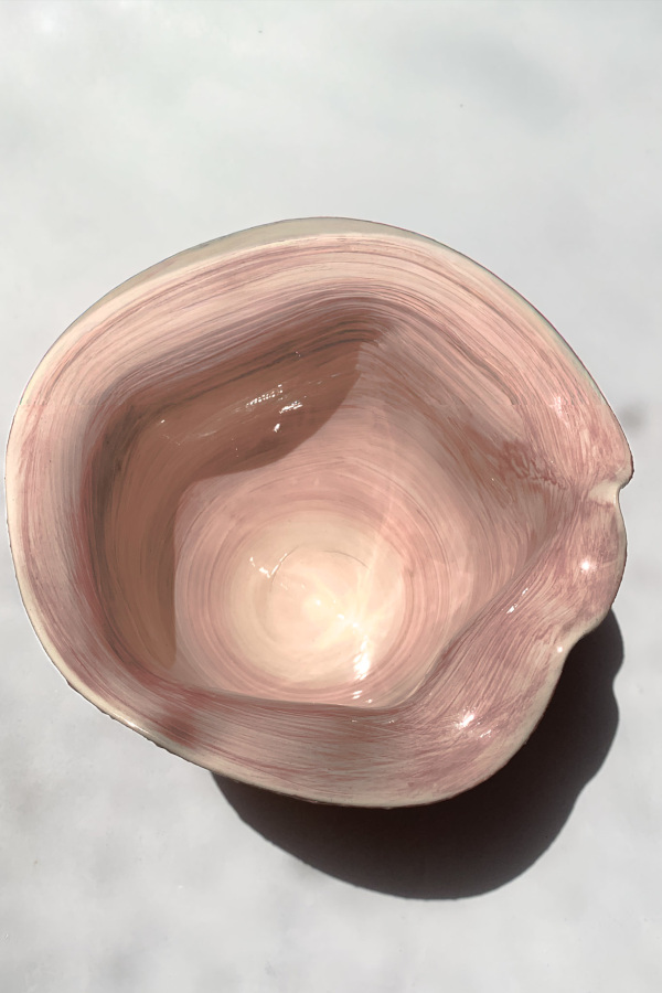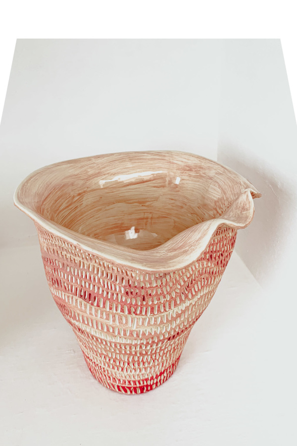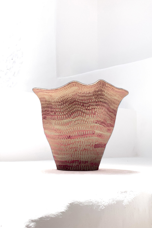 El exterior es una obra de arte en sí mismo: decorado tallando cada línea, una a una, completamente a mano. Estas incisiones forman un delicado degradado de engobes en tonos rosas, que va desde un coral vibrante hasta un suave rosado pastel, creando un efecto visual cálido y envolvente, y confiriendo una textura táctil fascinante. En contraste, su interior está cubierto con un esmalte brillante transparente, no solo realzando la belleza natural del gres, sino también asegurando su uso utilitario y aptitud para el contacto con alimentos.