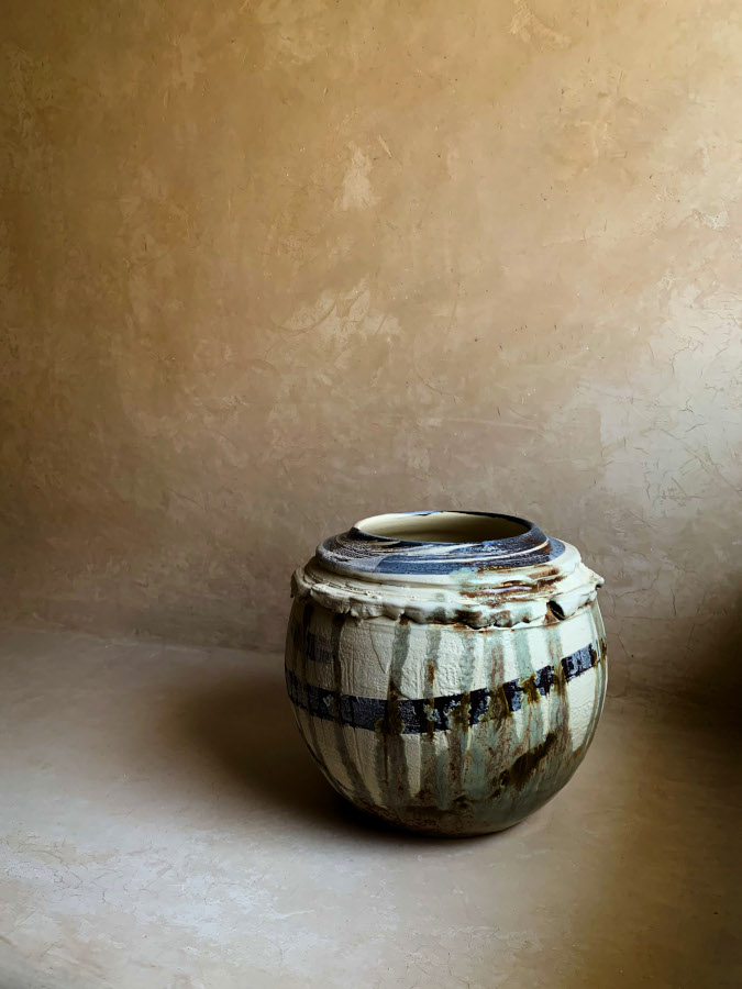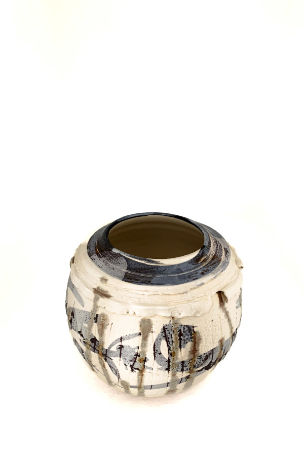 Decorada con trazos expresivos de óxido de hierro, un delicado engobe de porcelana y esmalte, esta vasija irradia una elegancia serena en sus tonos tierra de marrones y cremas, que recuerdan a la corteza robusta y la tierra fértil.
